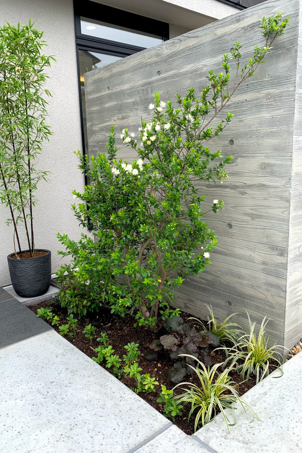 新しくできたデンタルクリニックのファサードです。モダンな建物に合わせてすっきりと落葉樹を中心に植栽しました。山採りのアオダモとコハウチワカエデのうねる曲線が建築の直線美と調和して上品です。雑木の庭のおすすめなところは素朴でありながらもある種の品が感じられるところでしょうか。